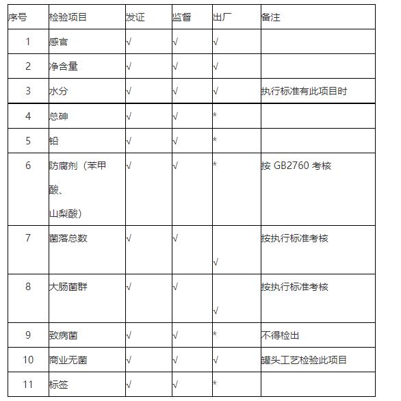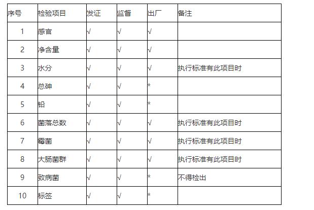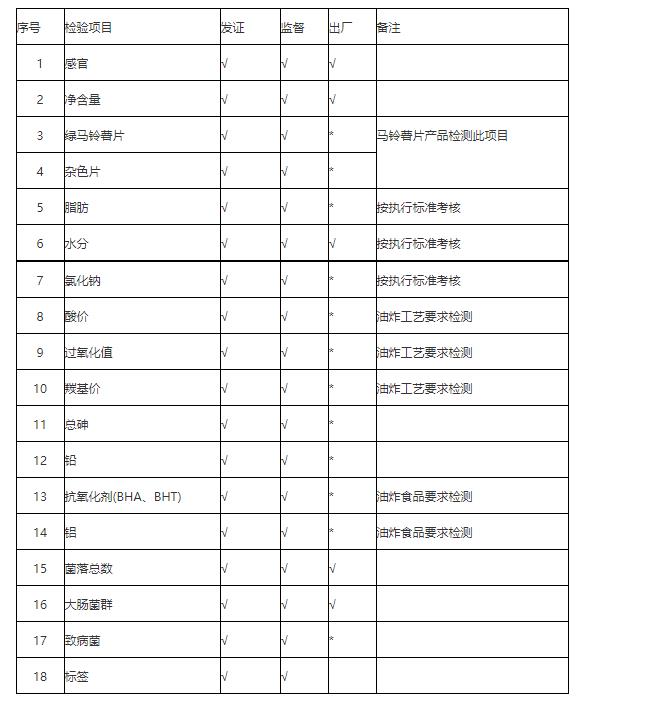 薯類食品的發證檢驗、監督檢驗、出廠檢驗按照表格所列的相應檢驗項目進行。出廠檢驗項目中注有“*”標記的,企業每年應當進行 2 次檢驗。